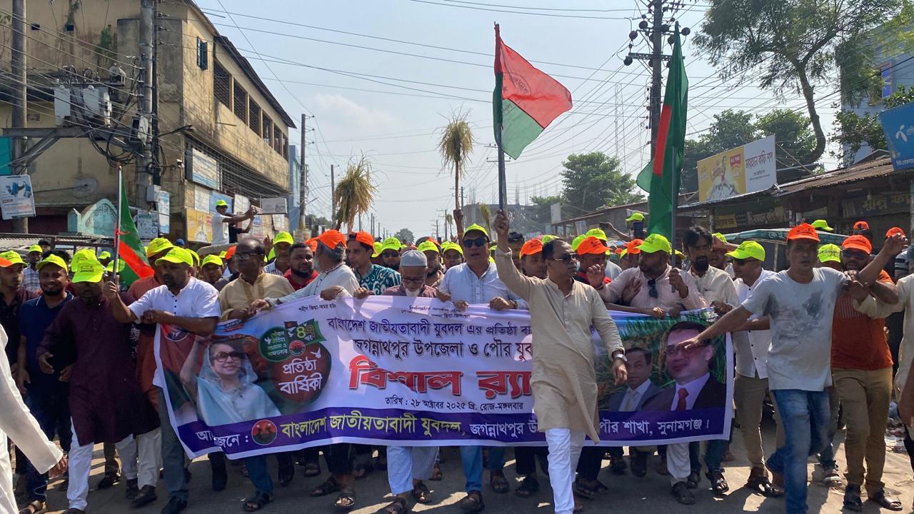 আজ ২৮ অক্টোবর ২০২৫ ইং রোজ মঙ্গলবার দুপুরে বাংলাদেশ জাতীয়তাবাদী যুবদলের ৪৭তম প্রতিষ্ঠা বার্ষিকী উপলক্ষে জগন্নাথপুর উপজেলা ও পৌর যুবদলের আয়োজনে জগন্নাথপুর উপজেলা বিএনপির কার্যালয় থেকে হাজারও নেতাকর্মীর অংশগ্রহণে একটি বিশাল র্যালী অনুষ্ঠিত হয়েছে। বিশাল র্যালীটি জগন্নাথপুর পৌর শহরের বিভিন্ন গুরুত্বপূর্ণ সড়ক প্রদক্ষিন শেষে পৌর পয়েন্টে পথসভা করেছে। যুবদলের বিশাল র্যালীতে উপস্থিত থেকে নেতৃত্ব দিয়েছেন বিএনপির জাতীয় নির্বাহী কমিটির সদস্য, যুক্তরাজ্য বিএনপির সাধারণ সম্পাদক, সুনামগঞ্জ ৩ (জগন্নাথপুর-শান্তিগঞ্জ) আসনে বিএনপির, ধানের শীষের মনোনয়ন প্রত্যাশী জননেতা জনাব কয়ছর এম আহমেদ।র্যালীতে উপস্থিত ছিলেন জগন্নাথপুর উপজেলা ও পৌর যুবদলের নেতাকর্মী সহ উপজেলার ৮টি ইউনিয়ন ও ওয়ার্ড যুবদলের সভাপতি, সাধারণ সম্পাদক সহ নেতাকর্মী বৃন্দ , জগন্নাথপুর পৌর যুবদলের নেতাকর্মী সহ পৌরসভার ৯টি ওয়ার্ড যুবদলের সভাপতি, সাধারণ সম্পাদক সহ নেতাকর্মী বৃন্দ। জগন্নাথপুর উপজেলা যুবদলের আহবায়ক, সুনামগঞ্জ জেলা যুবদলের সহ-সভাপতি আবুল হাশিম ডালিমের সভাপতিত্বে ও জগন্নাথপুর উপজেলা যুবদলের যুগ্ম-আহবায়ক জুবেদ আলী লখন ও জগন্নাথপুর পৌর যুবদলের যুগ্ম-আহবায়ক শামিম আহমেদের পরিচালনায় পথসভায় প্রধান অতিথির বক্তব্য রাখেন বিএনপির জাতীয় নির্বাহী কমিটির সদস্য, যুক্তরাজ্য বিএনপির সাধারণ সম্পাদক, সুনামগঞ্জ ৩( জগন্নাথপুর-শান্তিগঞ্জ) আসনের বিএনপির মনোনয়ন প্রত্যাশী জননেতা জনাব কয়ছর এম আহমেদ। তার বক্তব্যের শুরুতেই বাংলাদেশ জাতীয়তাবাদী যুবদলের প্রতিষ্ঠাতা, স্বাধীনতার ঘোষক শহীদ রাষ্ট্রপতি জিয়াউর রহমান কে গভীর শ্রদ্ধার সাথে স্বরণ করেছেন। স্বরণ করেছেন বিএনপির চেয়ারপার্সন দেশনেত্রী বেগম খালেদা জিয়া, বিএনপি ভারপ্রাপ্ত চেয়ারম্যান তারেক রহমান কে, স্বরণ করেছেন আন্দোলন সংগ্রামে নিহত আহত সকল বীর শহীদের। তিনি যুবদলের উদ্দেশ্যে বলেছেন আগামী জাতীয় সংসদ নির্বাচনে দেশনেত্রী বেগম খালেদা জিয়ার সালাম, তারেক রহমানের সালাম জগন্নাথপুরে প্রত্যেকটি ঘরে ঘরে পৌছে দিতে হবে। তিনি আরও বলেছেন সুনামগঞ্জ ৩ (জগন্নাথপুর-শান্তিগঞ্জ) আসনের জনসাধারণের জন্য কাজ করে যেতে চাই তাই জগন্নাথপুর ও শান্তিগঞ্জের জনসাধারণের সমর্থন চাই। আপনারা আমাকে সমর্থন করবেন আগামী জাতীয় সংসদ নির্বাচনে ধানের শীষে ভোট দিবেন। পথসভায় বিশেষ অতিথির বক্তব্য রাখেন জগন্নাথপুর উপজেলা বিএনপির আহবায়ক আবু হুরায়রা সাদ মাষ্টার, সুনামগঞ্জ জেলা বিএনপির সদস্য আব্দুল মুকিত, বক্তব্য রাখেন জগন্নাথপুর পৌর বিএনপির আহবায়ক সালাউদ্দিন মিটু, পৌর বিএনপির যুগ্ম-আহবায়ক আহবায়ক আব্দুল মতিন, জগন্নাথপুর উপজেলা 