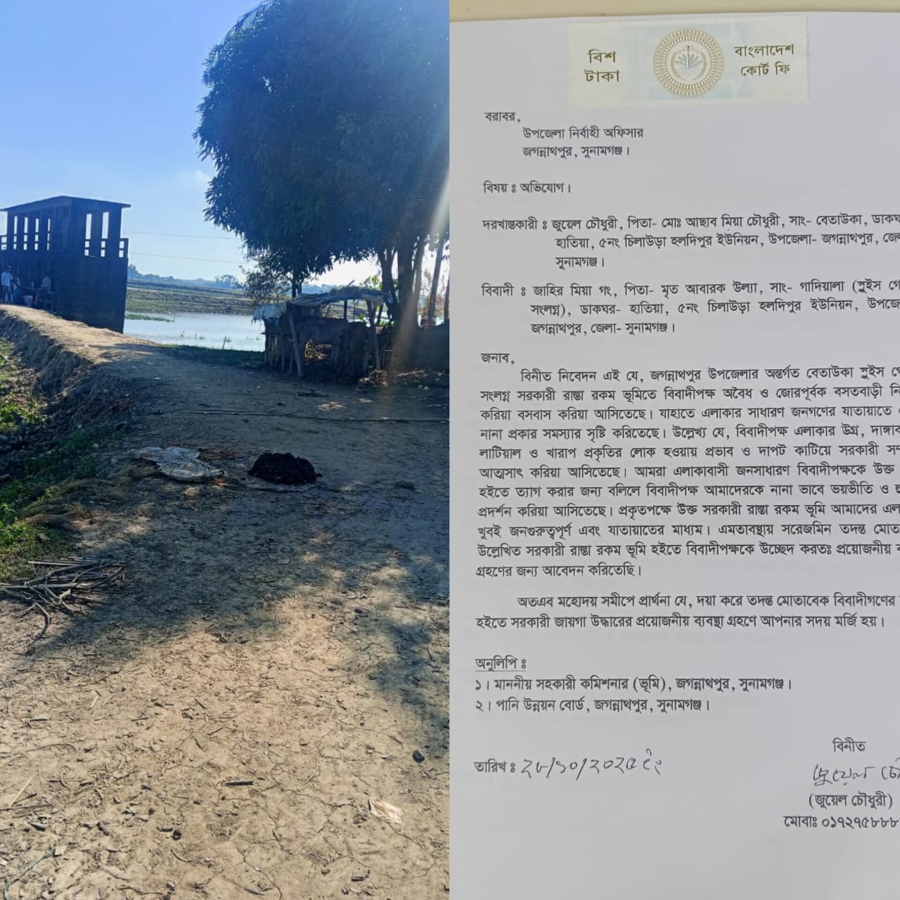 সুনামগঞ্জের জগন্নাথপুরের চিলাউড়া হলদিপুর ইউনিয়নের বেতাউকা স্লুইসগেইট সংলগ্ন সরকারি রাস্তা দখল করে অবৈধ ও জোরপূর্বক বসত বাড়ি নির্মাণের অভিযোগ উঠেছে।